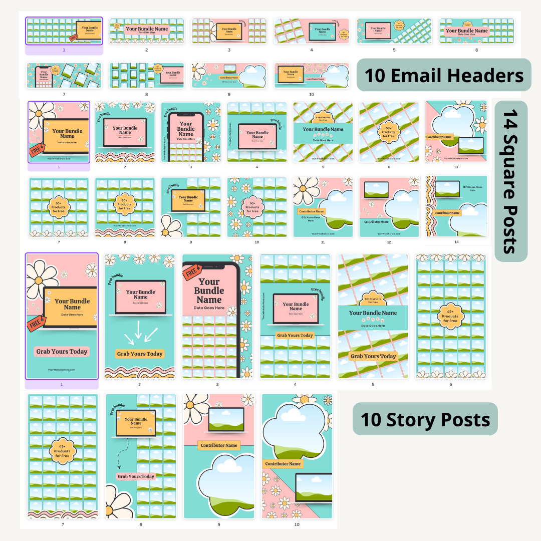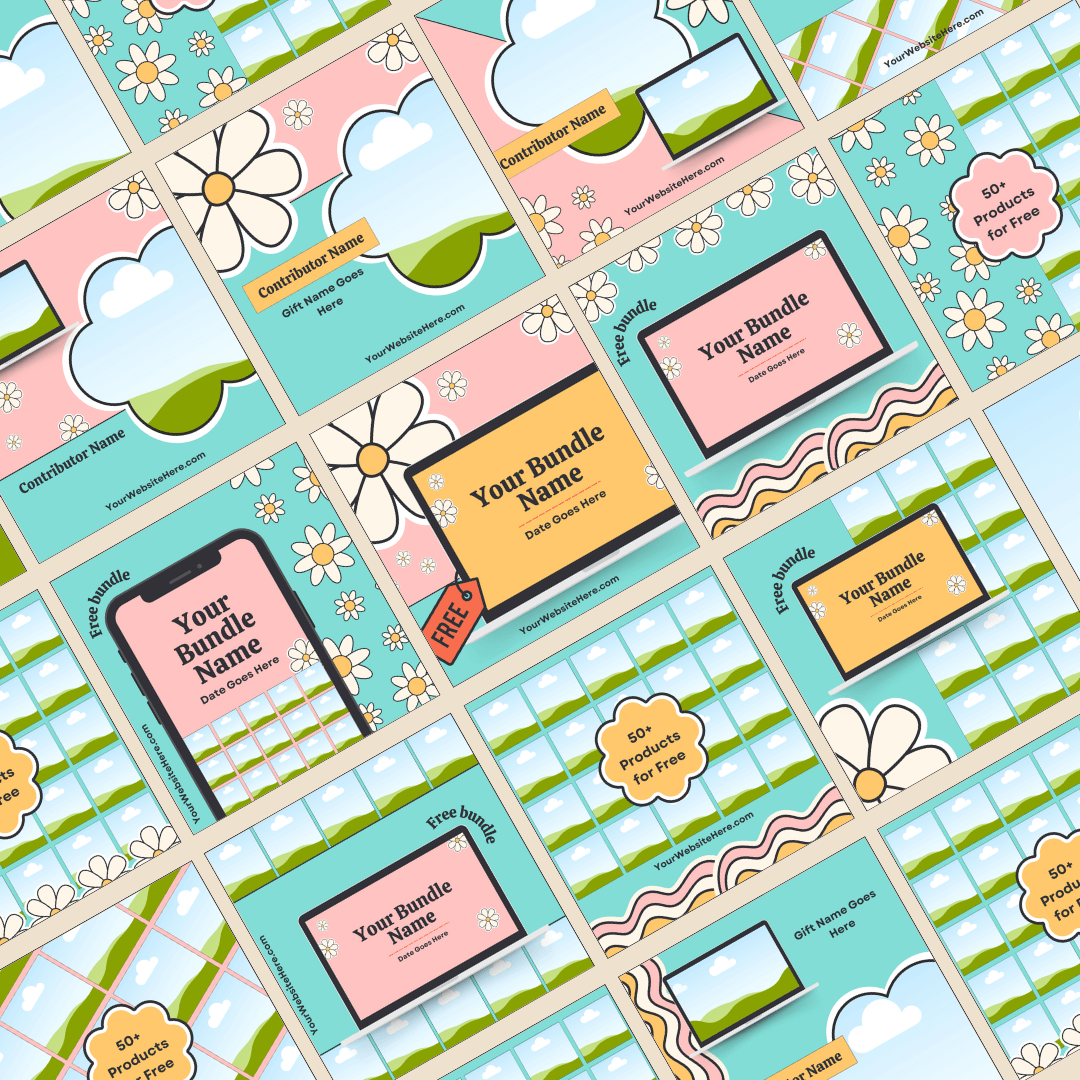 Show off all the products in your next bundle and highlight your contributors with these fun and bright mockups. Add your own branding and add or remove elements as needed!